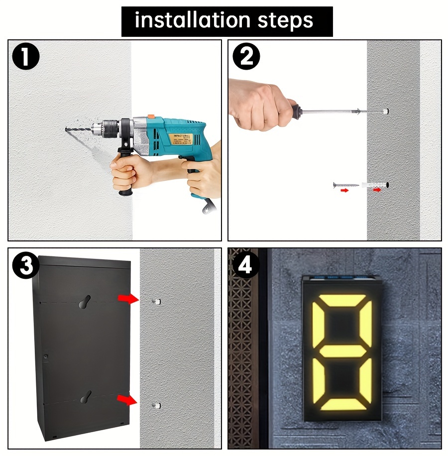 【SOLAR POWERED】 -- This Address Sign charges under sunshine, so you don't have to worry about placement. No need for any complicated wiring or plugs, simply wall-mount to your home or business and flip a switch. It's that easy.