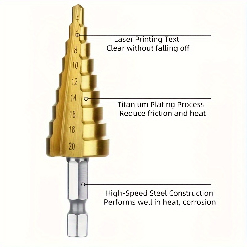 3-Piece Titanium-Coated Hss Step Drill Bit Set With Handle - Versatile For Plastic, Wood, Metal Sheet & Aluminum