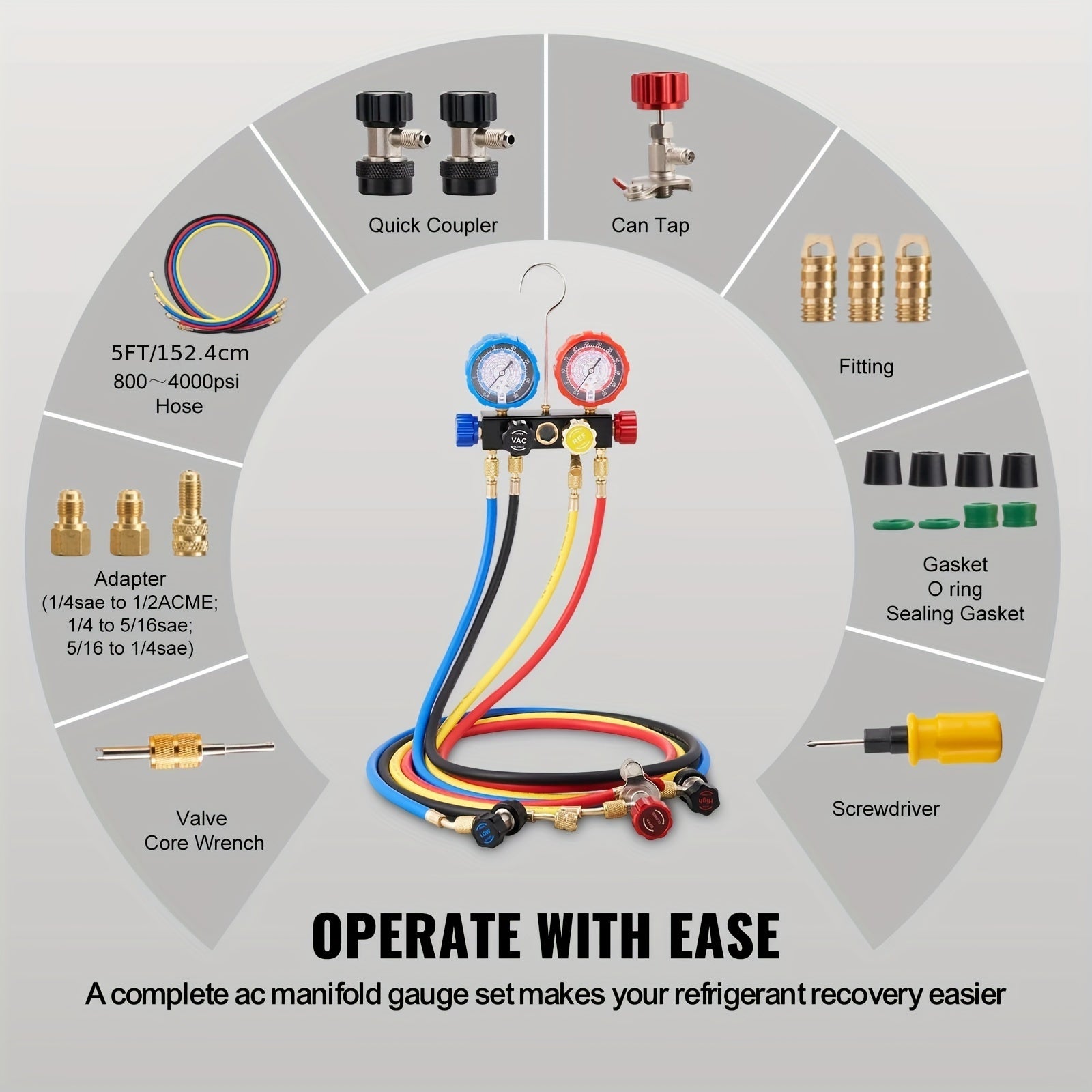 4 Way AC Gauge, Automotive AC Manifold, AC Manifold Gauge Set for R134A R22 R12 R410A Refrigerant, Gauge with 5ft Hoses, Couplers, Can Tap Works on Car Auto Charging and Evacuation
