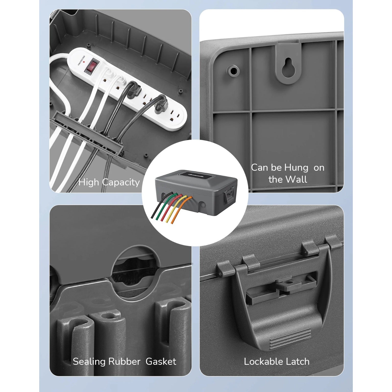 This box for connecting firmly and tightly has a rubber seal at each wire insertion point, ensuring a snug fit for the power cord. It also includes cable retention clamps inside, which securely hold the extension cords in place to prevent the plugs from sliding or disconnecting, even if the cords are pulled.