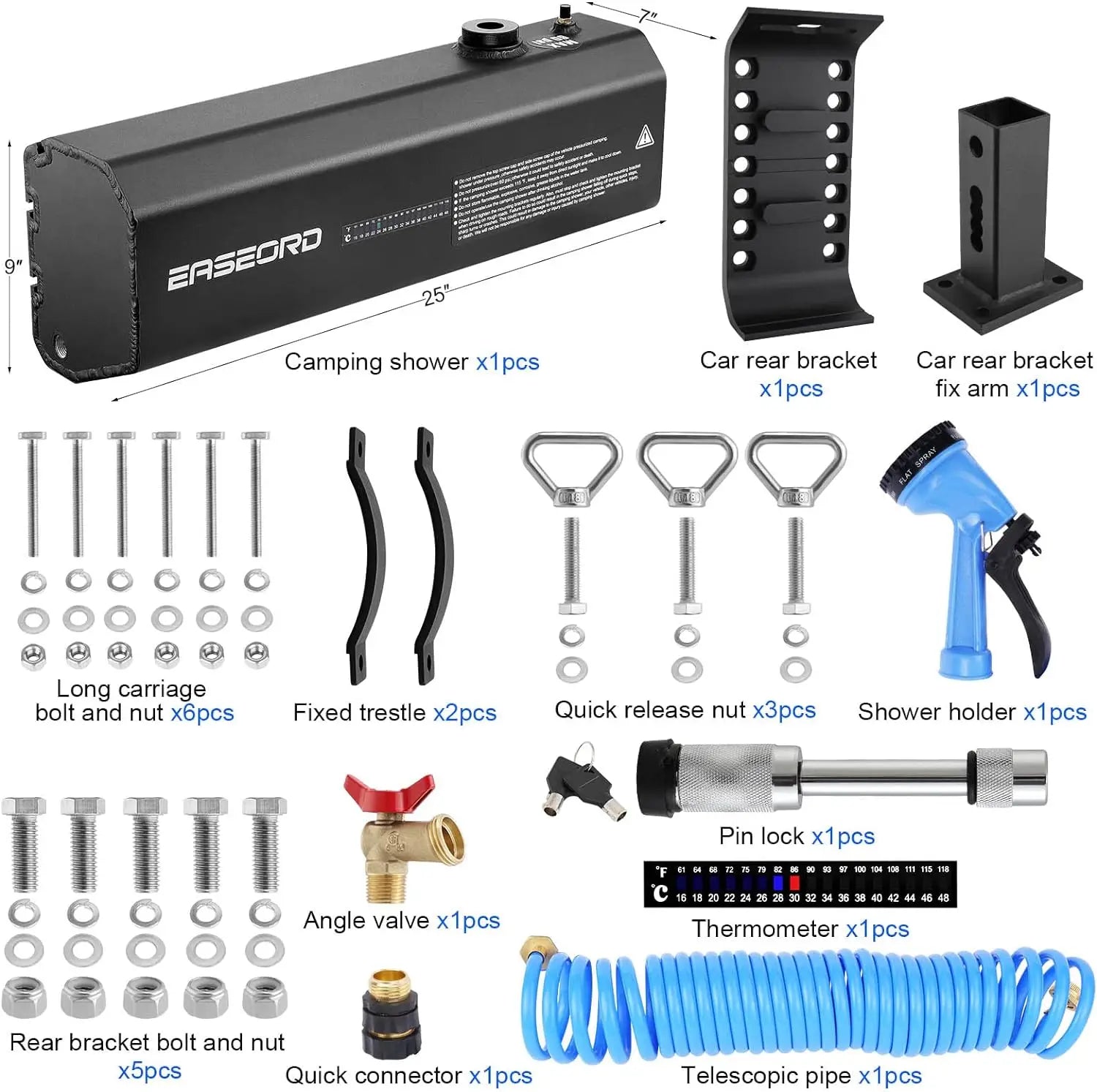 About this item Built to Last:This EASEORD road shower is made of high-strength aluminum and magnesium alloys,high quality hardware,which is strong and durable, It is very suitable for the use of complex field environment. Widely Application: Off-road shower tank perfect for overlander,camper,travelers. Pressurized water tank is ideal for on-the-go showers, cleaning and rinsing equipment after beach trips and surfing,camping,Overlanding,Hunting,Off-road racing,Emergency preparedness, fishing, hiking,BBQ,motocross,mud race,trail riding or any time you need pressurized water. Convenient and Portable:The pressuized water tank for your truck,SUV or off road vehicle is 25"long x9"wide x7"high,22lbs empty, Camping shower water tank can mount to Roof Rack Mounts,Hitch Mounts,Bumper Mounts. Solar Heated Temperature: RoadShower is solar heated and has a temperature gauge on the outside so you can see how warm the water is. You can enjoy warm showers at your campsite, beach and wherever your adventures take you. Perfect Design: Large top-cap allows for easy filling of the tank; Water tank with balance screw to keeping the water tank stable. The coiled hose with extension allows you to easily use when you are in the process of bathing and using water. Tips: Water tank pressure can not always be maintained, with the use of water, the internal pressure will be less and less, when the pressure is insufficient can be re-pressurized.