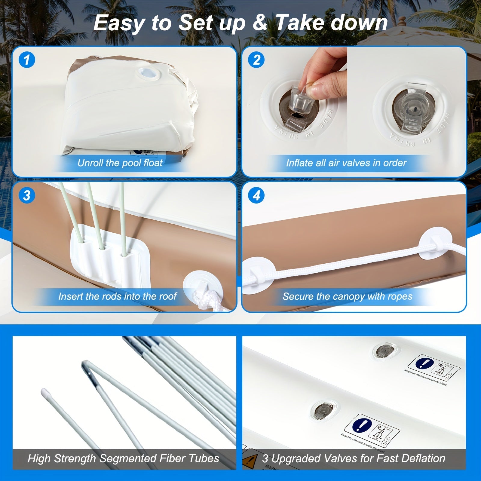 Water activities are summer essentials, enjoy coolness with our canopy island! The canopy supported by glass fiber tubes is made of 190T silver-coated fabric, presenting UPF 50+ for efficient sun protection. Meanwhile, the island is crafted of green PVC for cool touch, water resistance and wear resistance. With side grab ropes, you can pull it to anywhere you want, such as sea, lake, pool or beach, and lean on the ergonomic backrest as well as armrests.