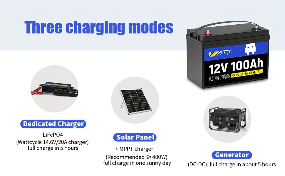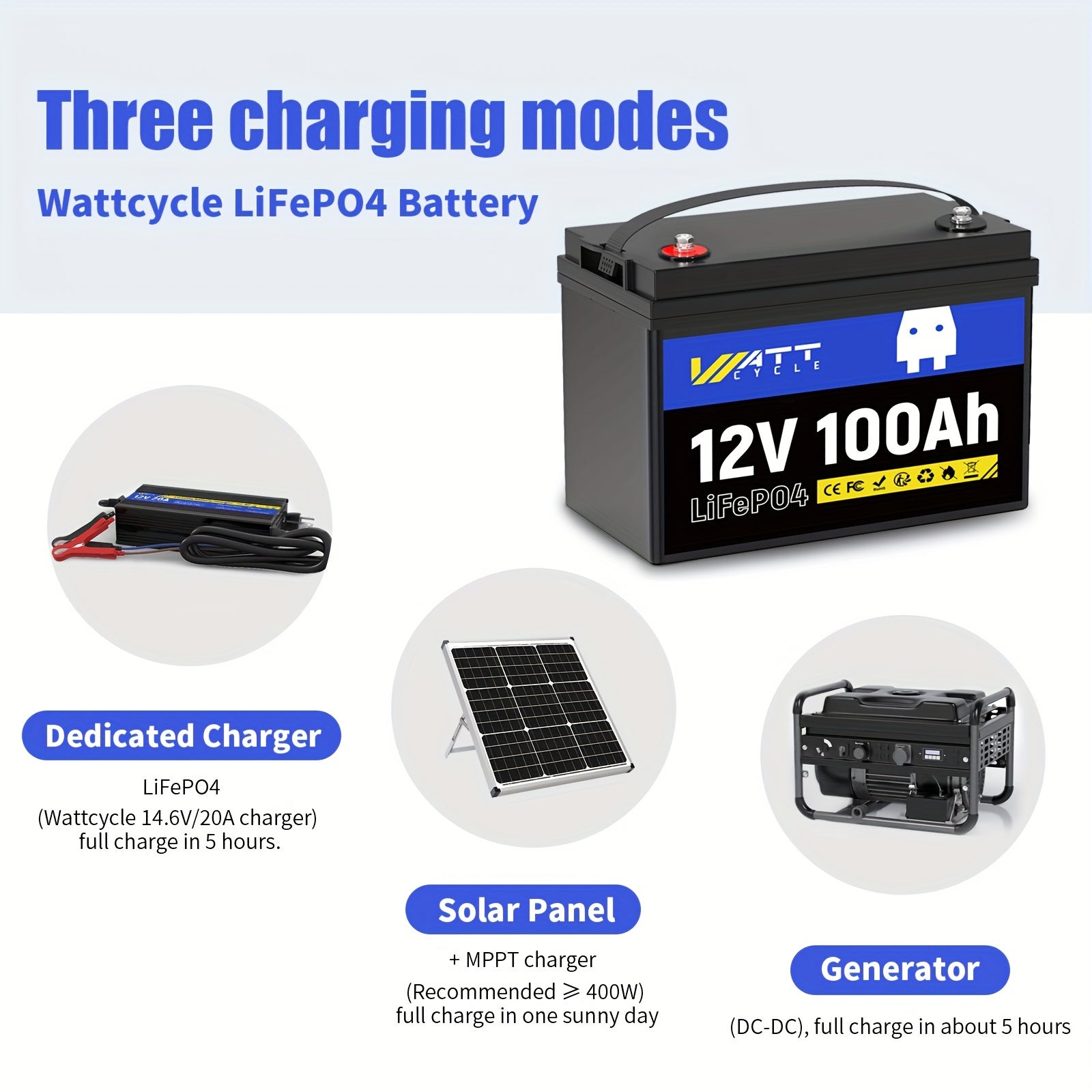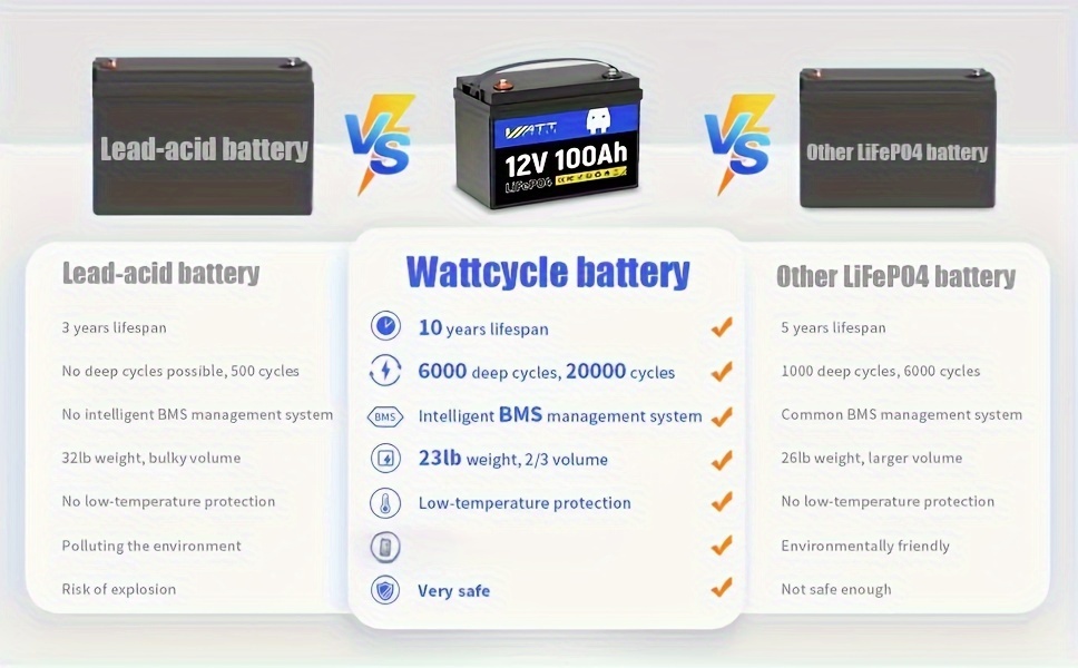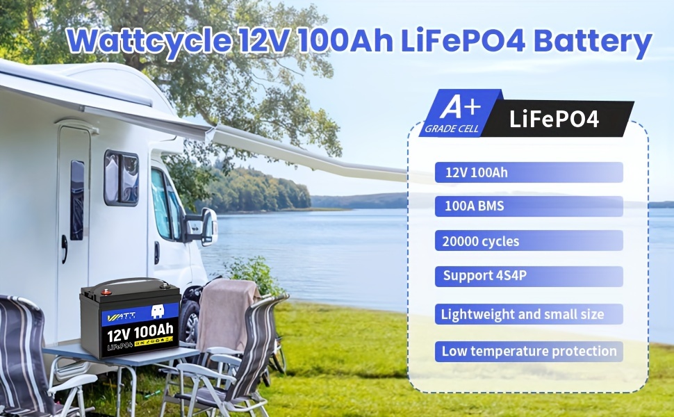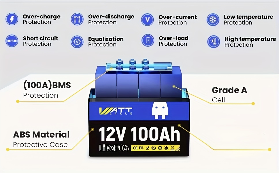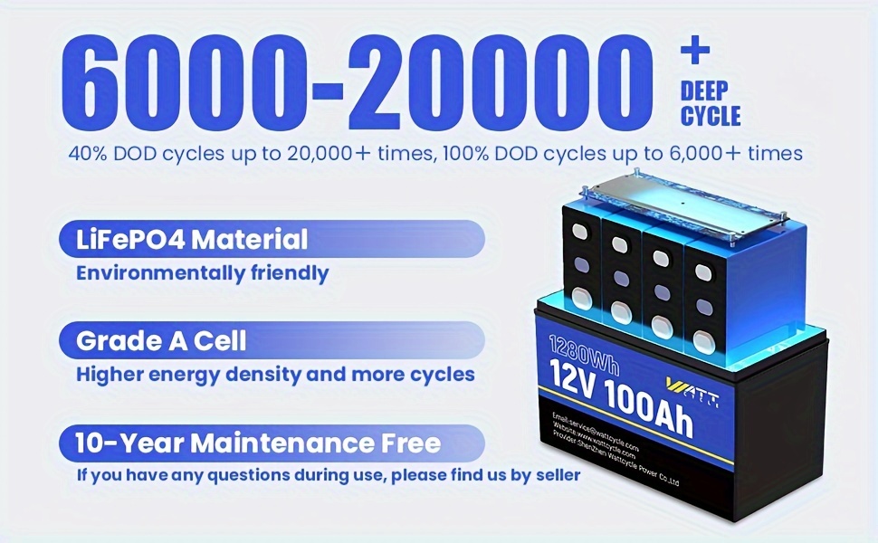 1.High Performance: The Wattcycle LiFePO4 battery has a capacity of 100Ah and a standard voltage of 12.8V. It features A+ grade cells and can endure up to 20000 cycles. It has obtained SDS/UN38.3/FCC/CE/ROHS certifications, ensuring its quality and safety.