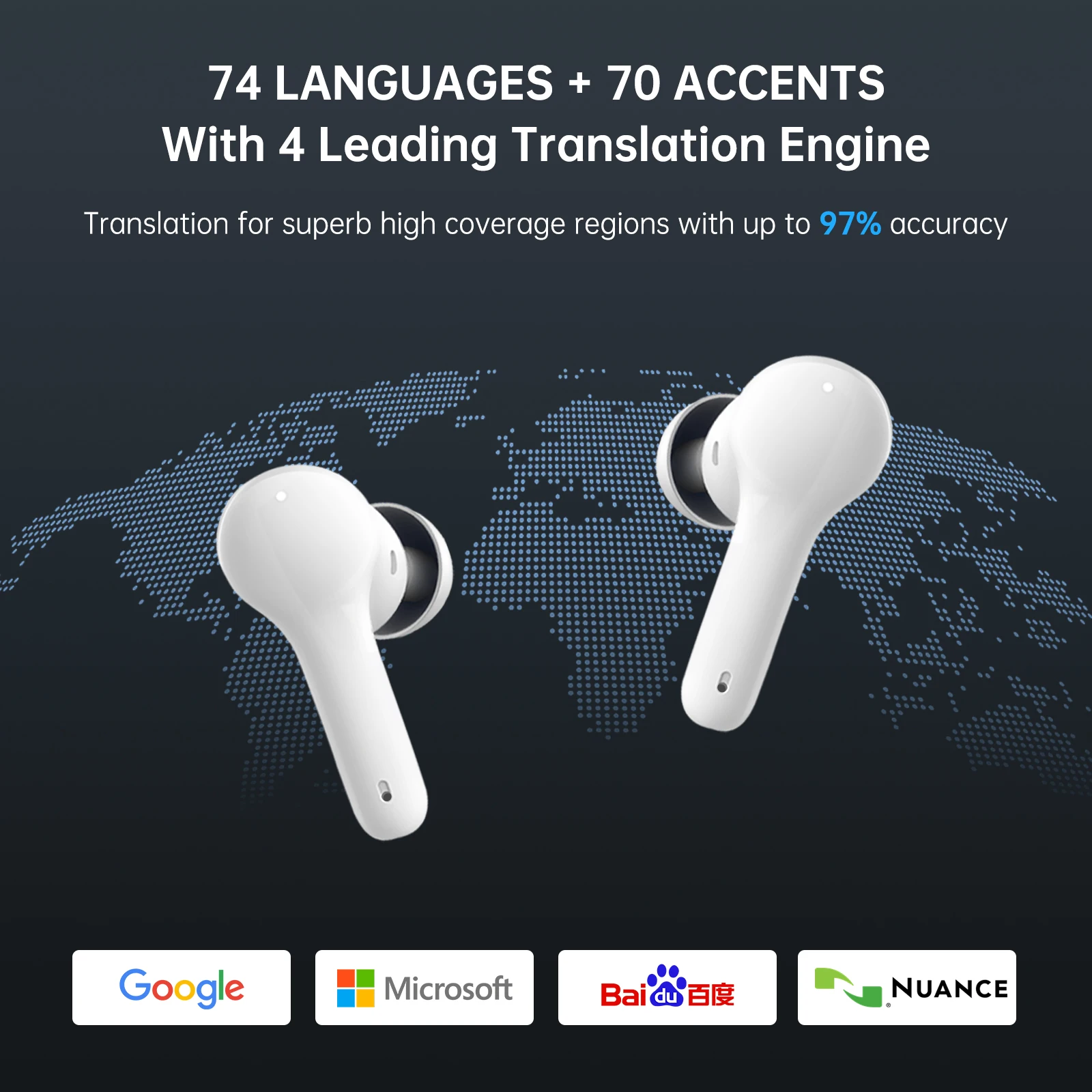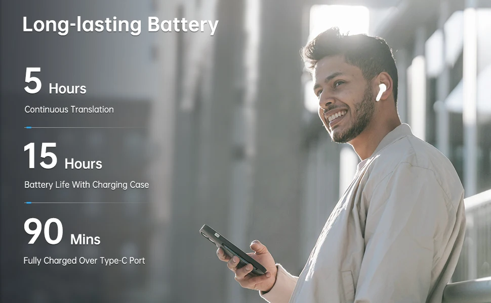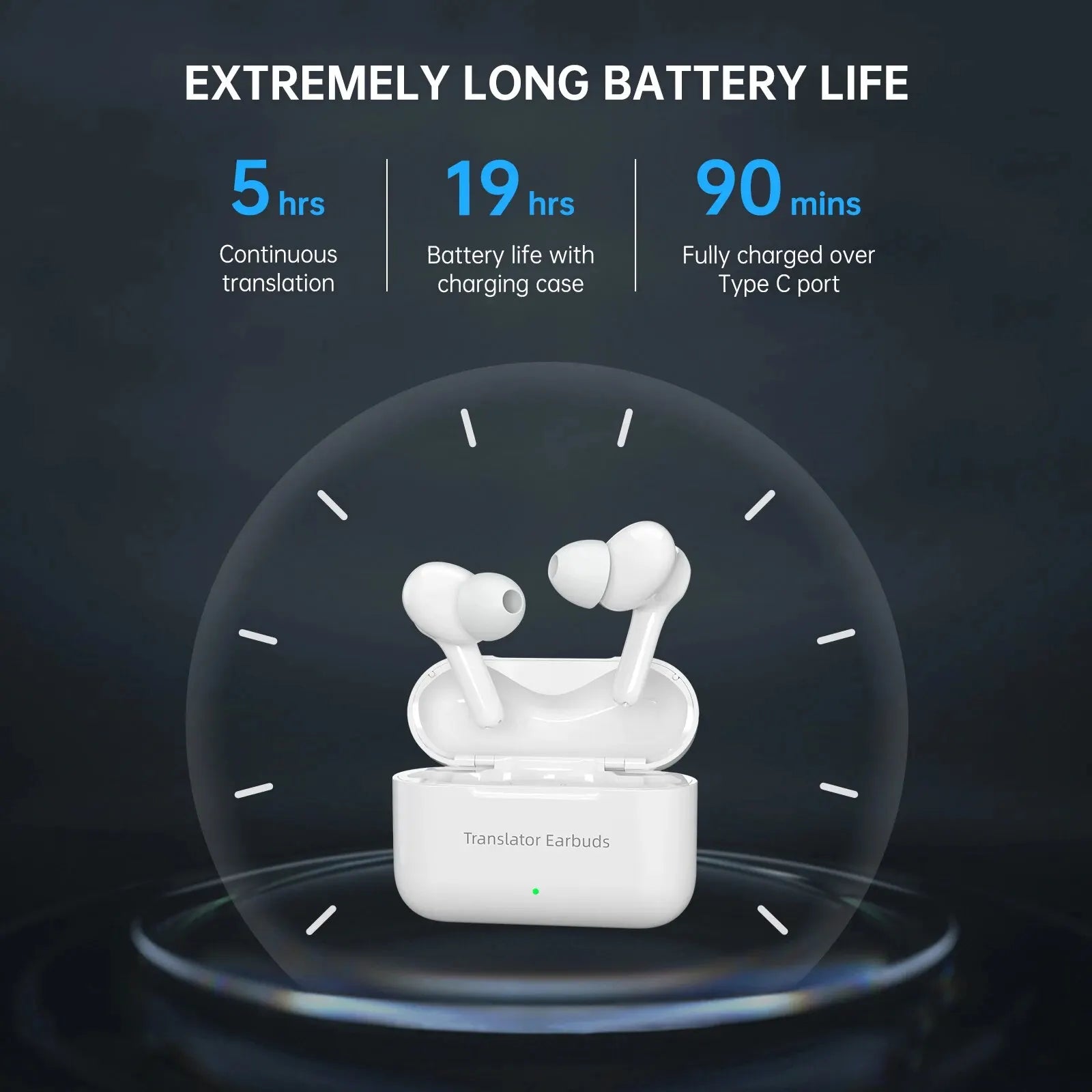【Long Battery Life for Uninterrupted Communication】 The earbuds can last up to 6 hours of continuous translation and come with a 19-hour battery life when used with the charging case which providing you with extended periods of uninterrupted use.