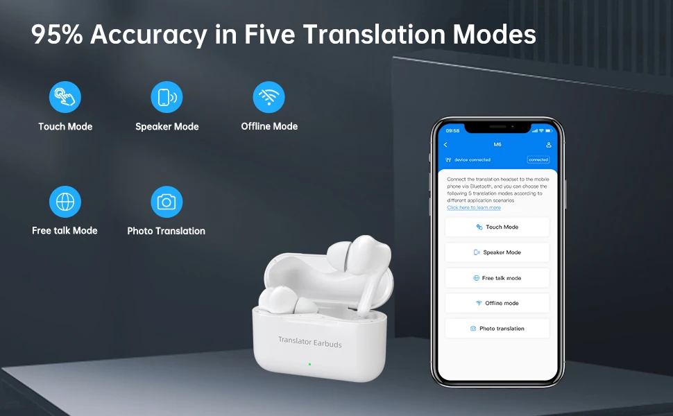 【Five Translation Modes for Any Communication Scenario】 The M6 Translator Earphone offer 5 different translation modes to cater to various communication scenarios: Touch Mode, Speaker Mode, Free Talk Mode, Offline Mode & Photo Translation Mode.